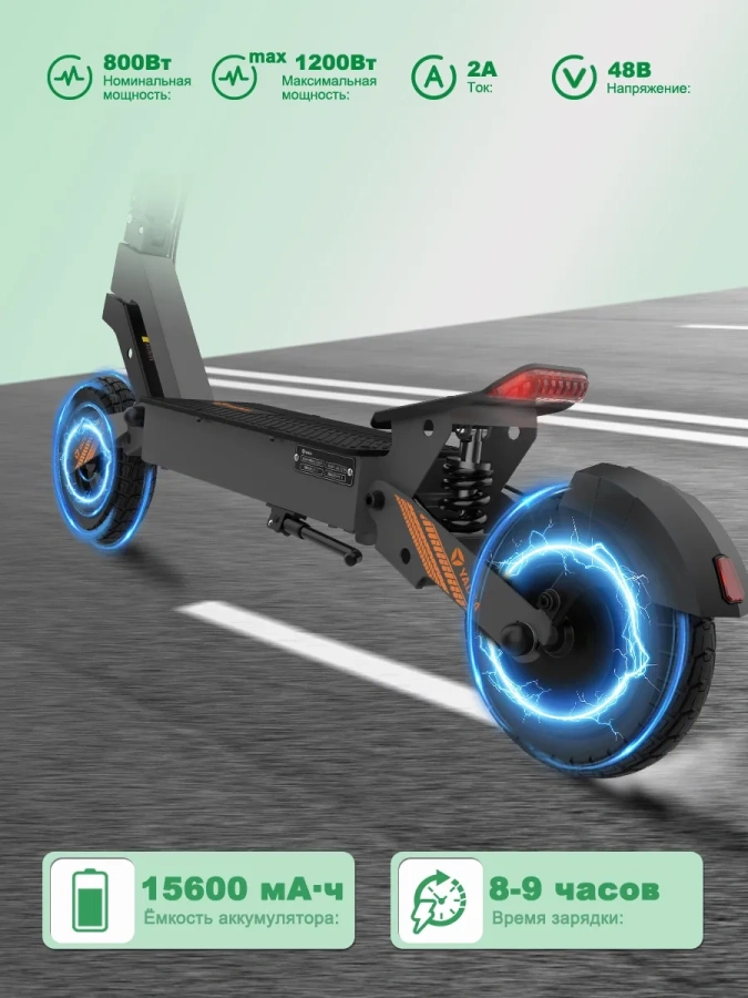 - Мощный аккумулятор 15,6 А·ч, 48 В — обеспечивает стабильную работу и уверенное ускорение даже на подъёмах.