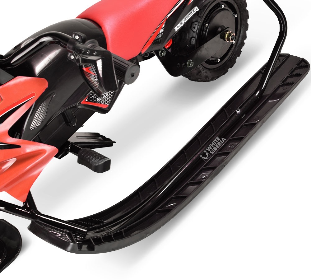 (красный) – это уникальное зимнее транспортное средство для детей. Наличие трех лыж, системы амортизаторов и мощного мотор-колеса на 800 Ватт с внедорожной покрышкой обеспечивает хорошую маневренность при езде с горок, по сугробам и отличную устойчивость на обледенелой дороге. По прямой можно разогнаться до внушительных 15 км/ч. Двойные (механический и электронный) тормоза имеют короткий тормозной путь. Передняя фара ярко освещает дорогу в темное время суток. Рабочая температура эксплуатации WHITE SIBERIA Belёk 800W составляет от 0 до минус 20 градусов. При температуре воздуха не ниже минус 8 градусов, Li-ion батарея напряжением 36V и емкостью 7.8Ah выдает до двух часов непрерывной работы, что эквивалентно максимальному запасу хода порядка 20 км. На руле расположены органы управления электроснегокатом и индикатор заряда батареи. При подъеме в гору используйте буксировочный трос с автоматической намоткой.