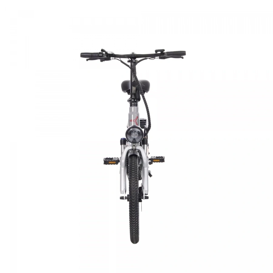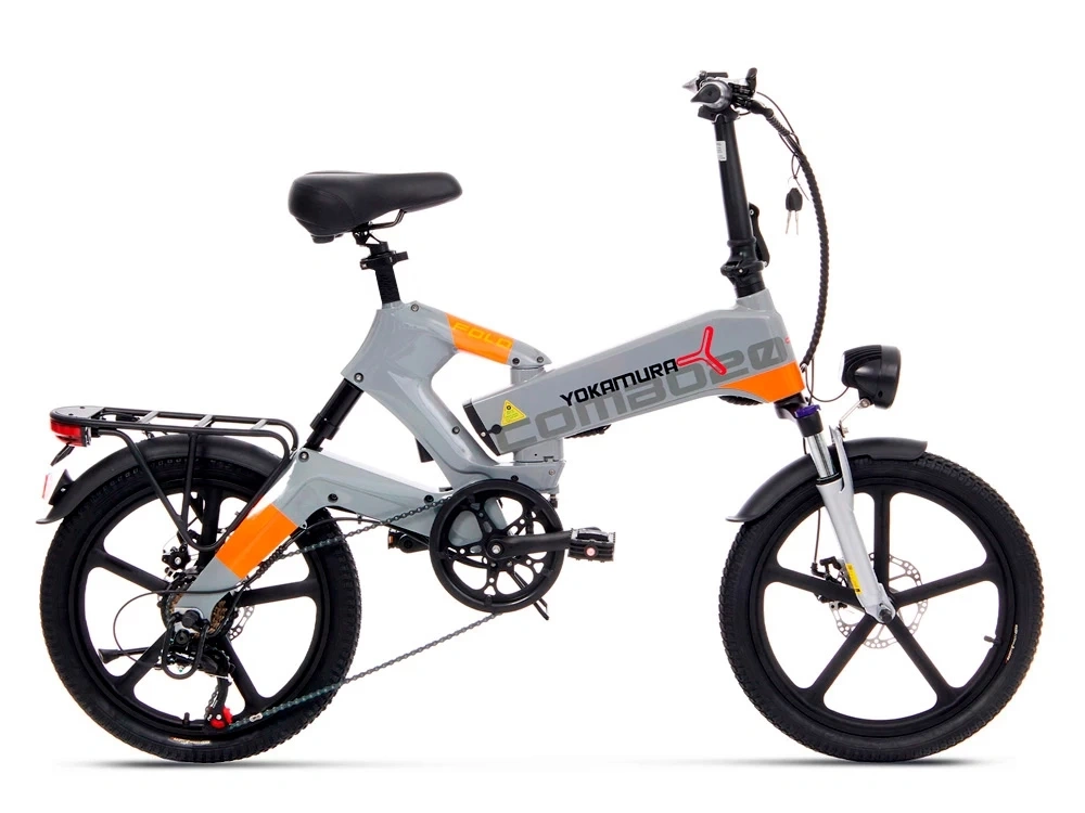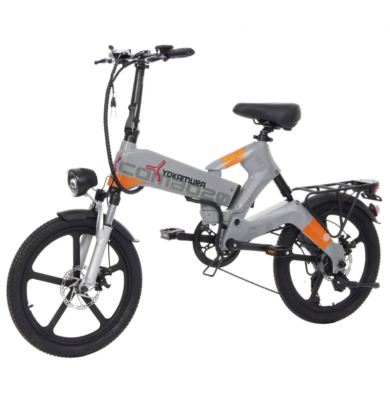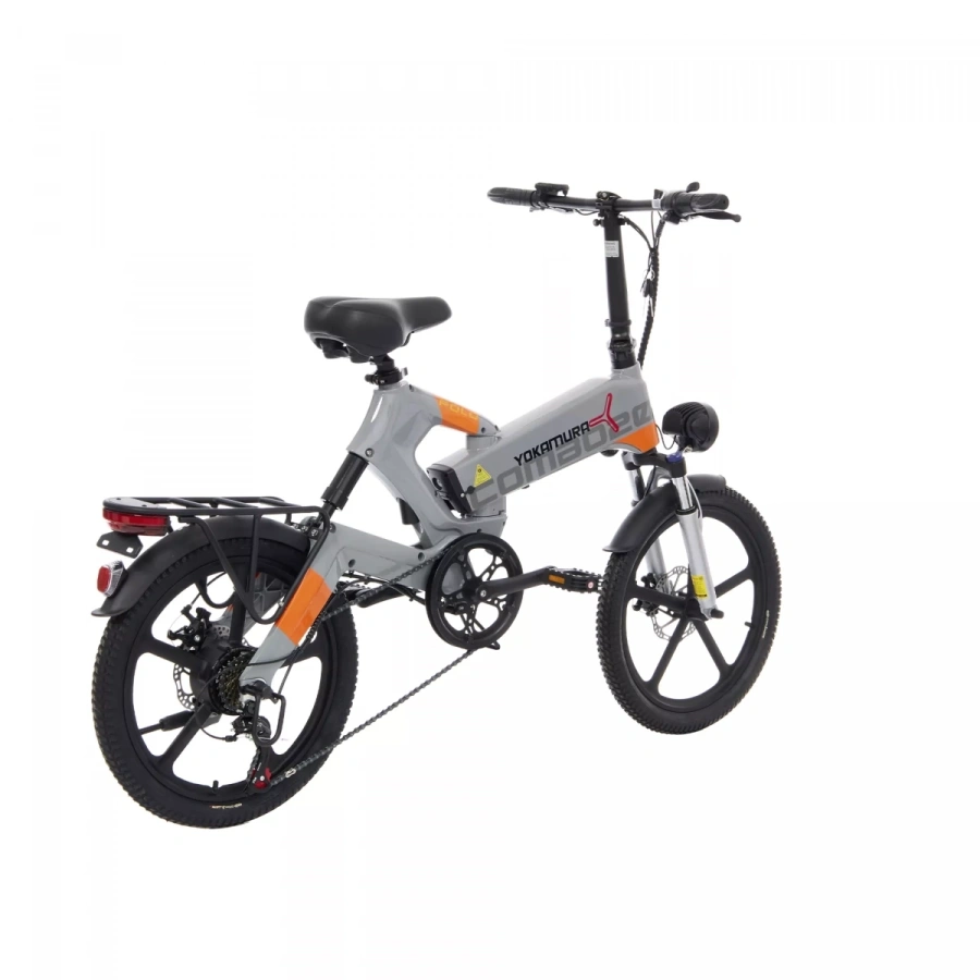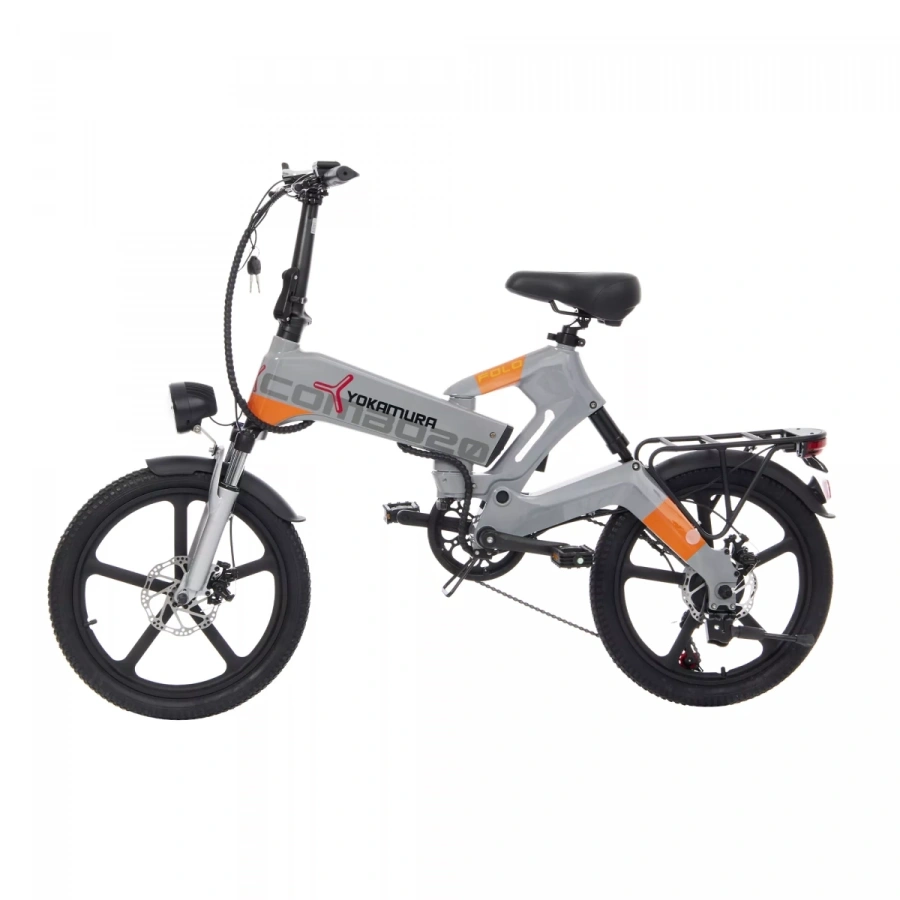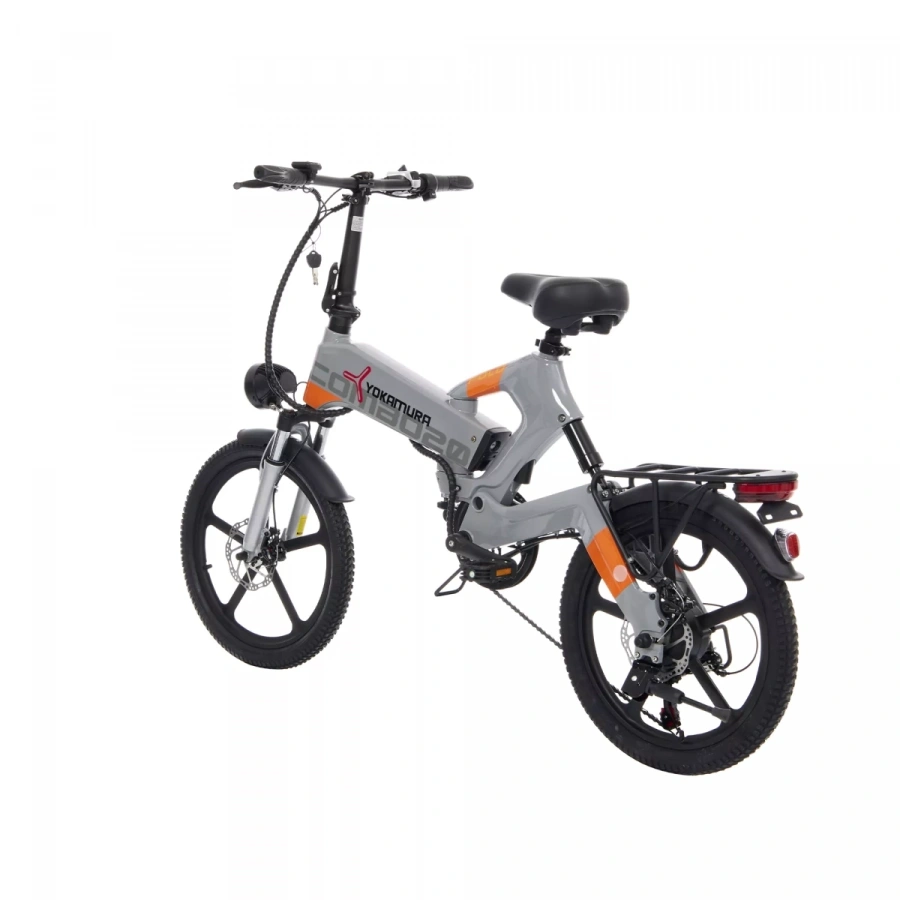 – современный городской электровелосипед от японского бренда Yokamura. Стильный дизайн, аккуратная сборка, практичность и функциональность – преимущества модели. Электровелосипед собран на легкой и прочной раме из магниевого сплава, надежной и устойчивой к коррозии. Рама, руль и педали – складные. Руль и сиденье регулируются по высоте. Обладает регулируемой передней амортизационной вилкой с блокировкой и задним амортизатором, колесами диаметром 20 дюймов со стильными литыми дисками из алюминиевого сплава и покрышками для электровелосипедов CST. Имеет надежные дисковые механические тормоза. Укомплектован крупной и яркой LED-фарой и задним фонарем, расположенным на багажнике, функциональным LCD-дисплеем, переключателем механических скоростей Shimano (7 скоростей), крыльями, подножкой.