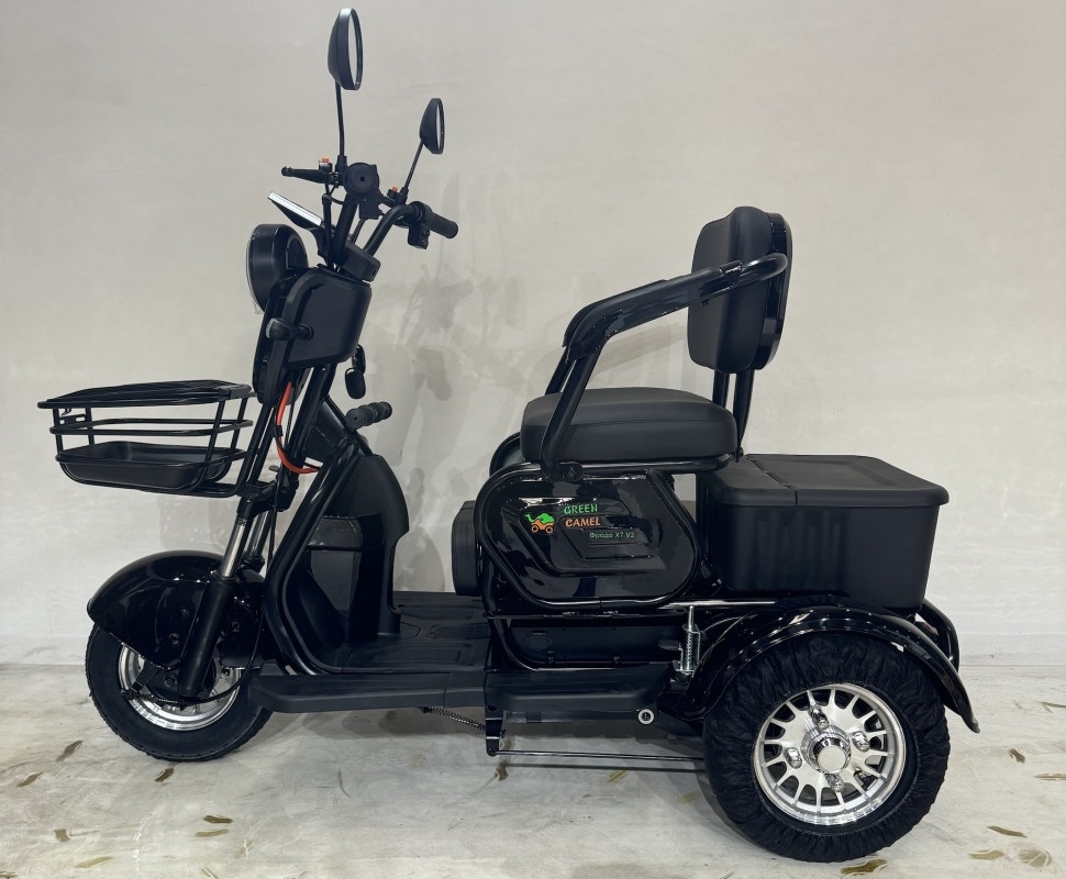 Электротрицикл Фродо X7 от команды GreenCamel – это образец универсального городского электротранспорта для семьи из трех человек. Модель Фродо X7 путём нескольких манипуляций может трансформироваться из трицикла с широким креслом для водителя в семейный транспорт со сдвижным сиденьем для пассажира и раскладным сиденьем для ребёнка перед водителем. В комплектацию трицикла входит передняя корзина и задняя большая корзина. Оптимальная колёсная формула с одним передним колесом и ведущей задней парой обеспечивает устойчивость в поворотах. Задняя пара гидравлических амортизаторов отвечают за комфорт в поездках. Передний и задний барабанные тормоза и ножной рычаг заднего тормоза отвечают за быстрые безопасные установки. Дальность пробега на штатной гелевой SLA батарее с ёмкостью 20Ач до 50 км. Трицикл оснащен яркой светодиодной фарой с режимами дальнего и ближнего света, ходовыми огнями, поворотниками, стоп-сигналом, зеркалами заднего вида и может перемещаться на выделенной полосе дороги при наличии водительского удостоверения и возрасте водителя старше 16 лет (согласно изменениям в ПДД с 1.03.23 г.). Трицикл Фродо X7 оборудован сигнализацией с брелоком управления, так что вы не будете переживать за сохранность вашего индивидуального транспорта. Очевидным плюсом покупки индивидуального электротранспорта от компании GreenCamel является расположение компании и осуществление гарантийного обслуживания на территории РФ с постоянно пополняемым складом продукции и отделом ремонта аккумуляторных батарей. А также оперативная онлайн поддержка в мессенджерах на протяжении всего срока службы техники.